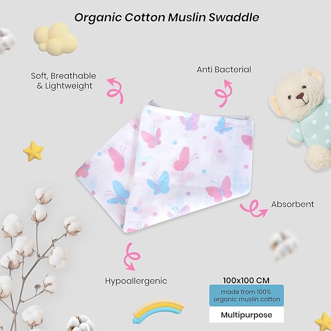 • Ultra Soft & Breathable Muslin Cotton: Made from premium muslin cotton that is gentle, lightweight, and allows your baby’s skin to breathe comfortably.
