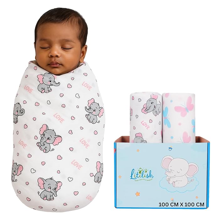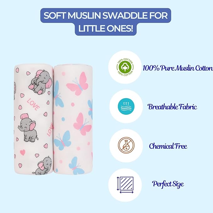 • Pack of 2 Cute Prints: Includes two adorable swaddles with Elephant and Butterfly prints, keeping your little one cozy, stylish, and comfortable.