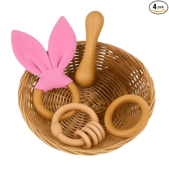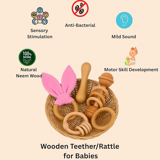 Baby Teether Combo Pack of 4 – Organic Neem Wood Teether, 1 Ring , 1 Ring Rattle, 1 Ring with Bunny Ear Cloth, 1 Dumbbell Nibbler – Safe Natural Teething Toys | Wooden Teethers for 6 to 12 Months Baby